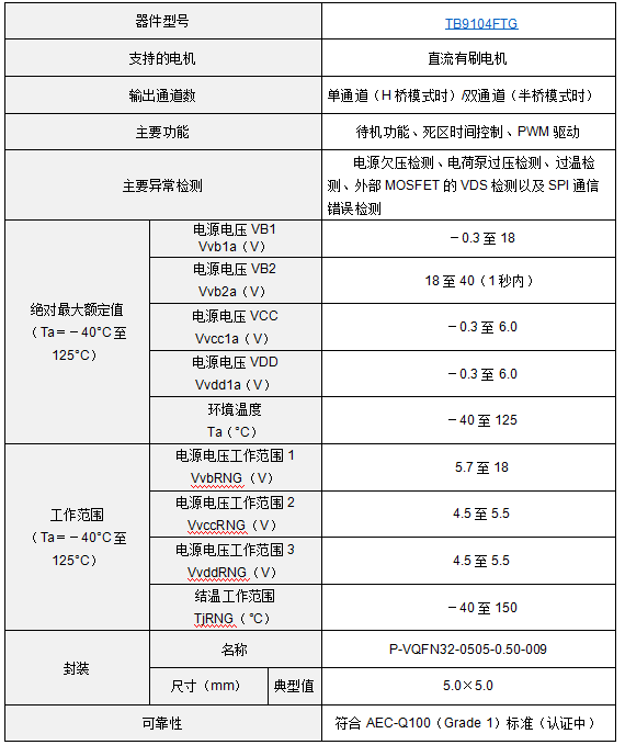 TB9104FTG采用5.0mm×5.0mm(典型值)的小型VQFN32封裝。封裝底部的裸露散熱焊盤可以有效提升散熱性能,通過與外部MOSFET配合使用,可實(shí)現(xiàn)緊湊的驅(qū)動(dòng)電路,適用于車身系統(tǒng)應(yīng)用中的大電流直流有刷電機(jī)。