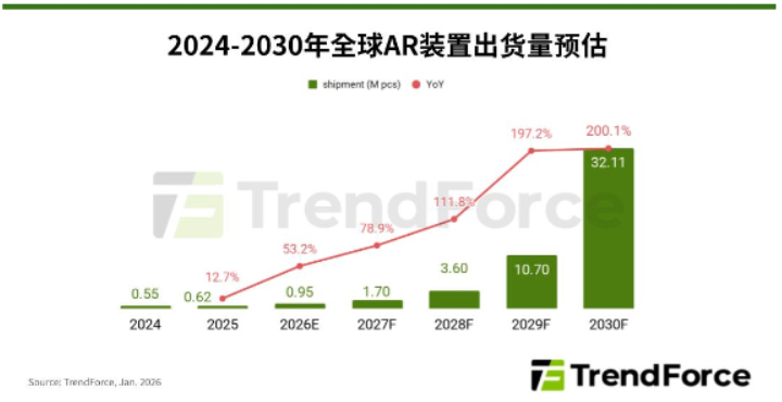 Jan. 30, 2025 ---- 根據(jù)TrendForce集邦咨詢最新近眼顯示產(chǎn)業(yè)調(diào)查,隨著AI與穿戴式裝置深度融合,Meta Ray-Ban Display Glasses在終端市場獲得的回饋明顯優(yōu)于預(yù)期,近半年內(nèi)已大幅上修多項(xiàng)關(guān)鍵零部件訂單。在大廠推波助瀾之下,TrendForce集邦咨詢預(yù)估2026年全球AR眼鏡出貨量將躍升至95萬臺,年增率為53%。