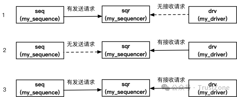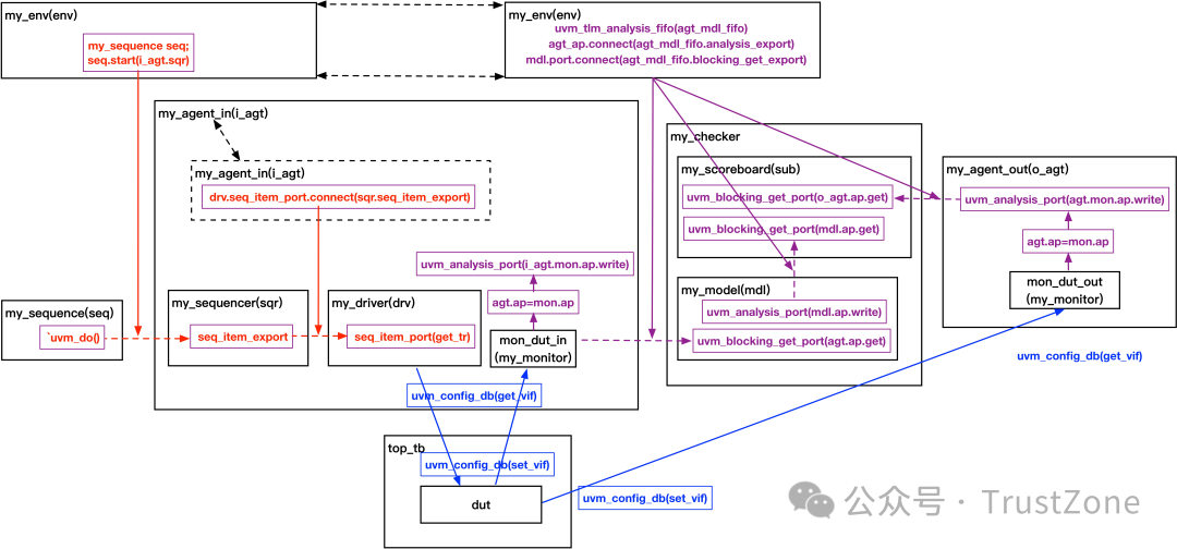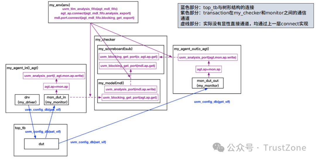 注意:top_tb與樹形結(jié)構(gòu)之間的交互用虛線,是因?yàn)閙y_driver.interface.output_xxx不是直接給top_tb.interface.input_xxx傳值,而是在采用了config_db機(jī)制后,類似于兩邊在操作同一個(gè)指針地址,即改變my_driver.interface.output_xxx的值,就等于直接改變了top_tb.interface.input_xxx中變量的值。