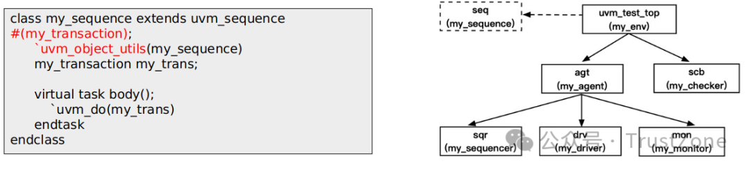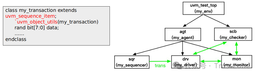 這里sequencer是一個(gè)固定組件,sequencer主要將激勵(lì)承接給driver,my_transaction是一個(gè)數(shù)據(jù)包,也就是測試激勵(lì),這里還要有一個(gè)sequence概念,sequence里存放一組trans,提供給sequencer,可見sequencer屬于component類,sequence和trans屬于object類。