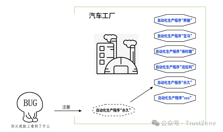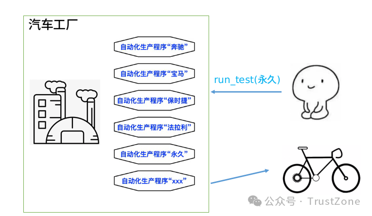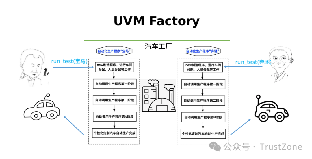 如下圖,一個(gè)汽車工廠好比我們的驗(yàn)證平臺,支持寶馬和奔馳兩條生產(chǎn)線,兩位老板只需下令生產(chǎn)奔馳還是寶馬,工廠按照生產(chǎn)線自動加工,最終產(chǎn)出汽車,這里指令(奔馳/寶馬)就是上述中的字符串,生產(chǎn)線就是調(diào)用其phase執(zhí)行的機(jī)制,整個(gè)驗(yàn)證平臺也就相當(dāng)于工廠,這就是UVM Factory。
