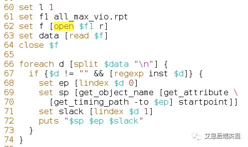 實(shí)際的工作中,foreach是一個(gè)常用的命令,再加上對(duì)文件讀取訪(fǎng)問(wèn),可以使用簡(jiǎn)單的tcl腳本實(shí)現(xiàn)比較復(fù)雜的操作,例如:讀入timing report -> 使用foreach對(duì)文件內(nèi)容進(jìn)行解析 -> 滿(mǎn)足某種條件下的觸發(fā)操作命令: