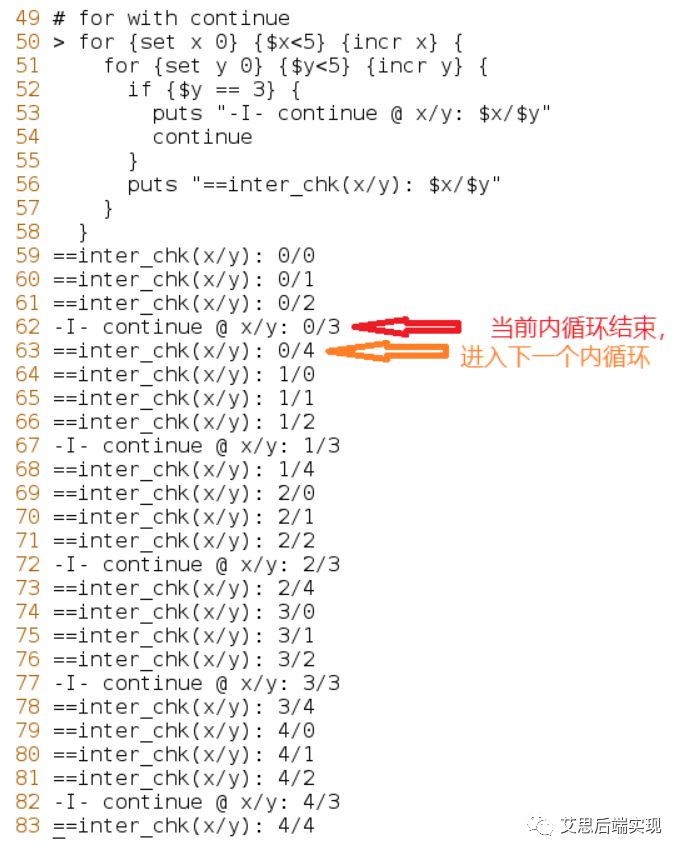 細(xì)心的讀者,可以從第62、63行可以看出continue的命令運(yùn)行方式了吧:當(dāng)前循環(huán)立刻結(jié)束,立刻啟動(dòng)下次循環(huán)。