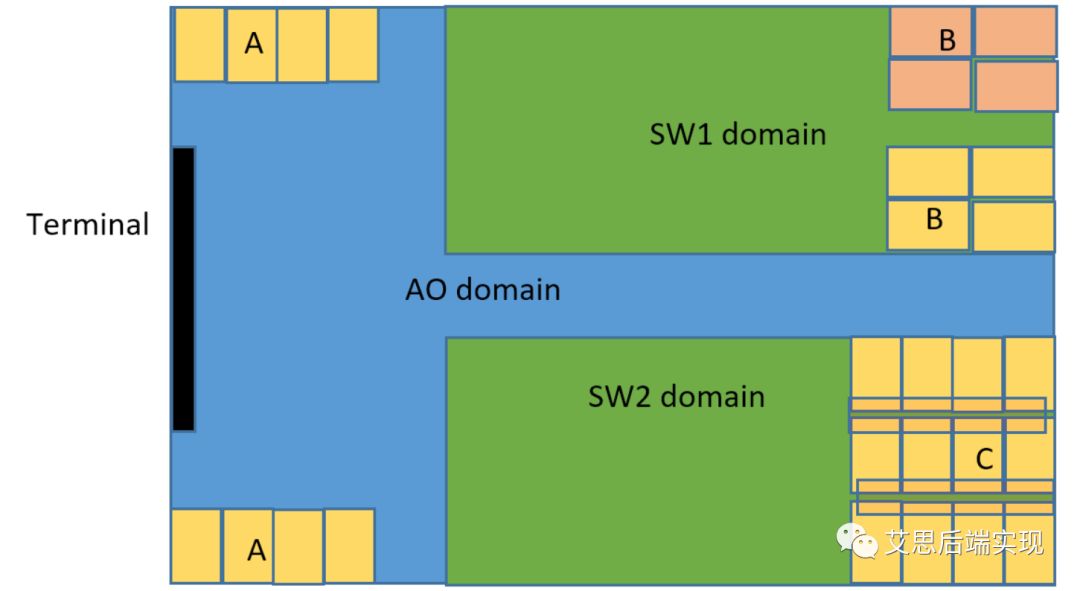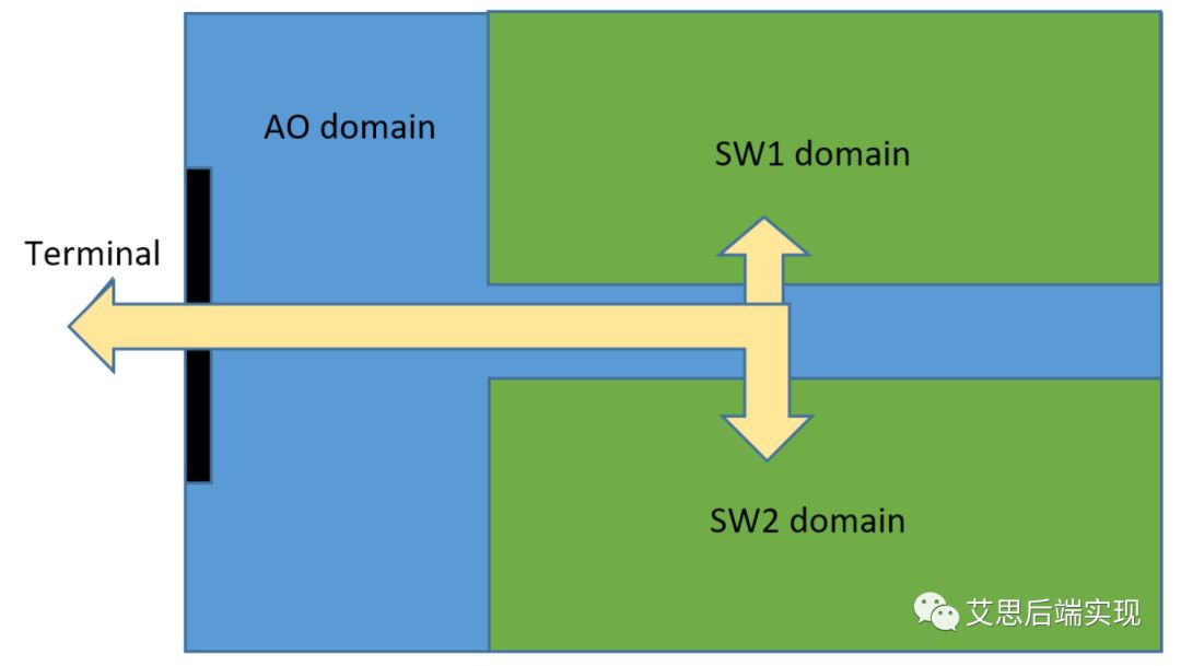 這就像是我們家里的套間格局,你們家有幾個小房間,就有多少的SW power-domain,每一個power-domain對應(yīng)在物理區(qū)域里就是voltage-area,客廳、過道就是default-domain。如果外界要訪問小房間一定要經(jīng)過:大門(terminal)、客廳(AO default domain)然后再到各個小房間(SW domain)。反之亦然,這個流程也就是我們常說的數(shù)據(jù)流向問題,要認識到這一點,對你的floorplan的規(guī)劃會有很好的幫助。下圖是一個簡單的AO, SW domain的規(guī)劃圖,信號通過terminal先進到了AO ,然后再進入SW。