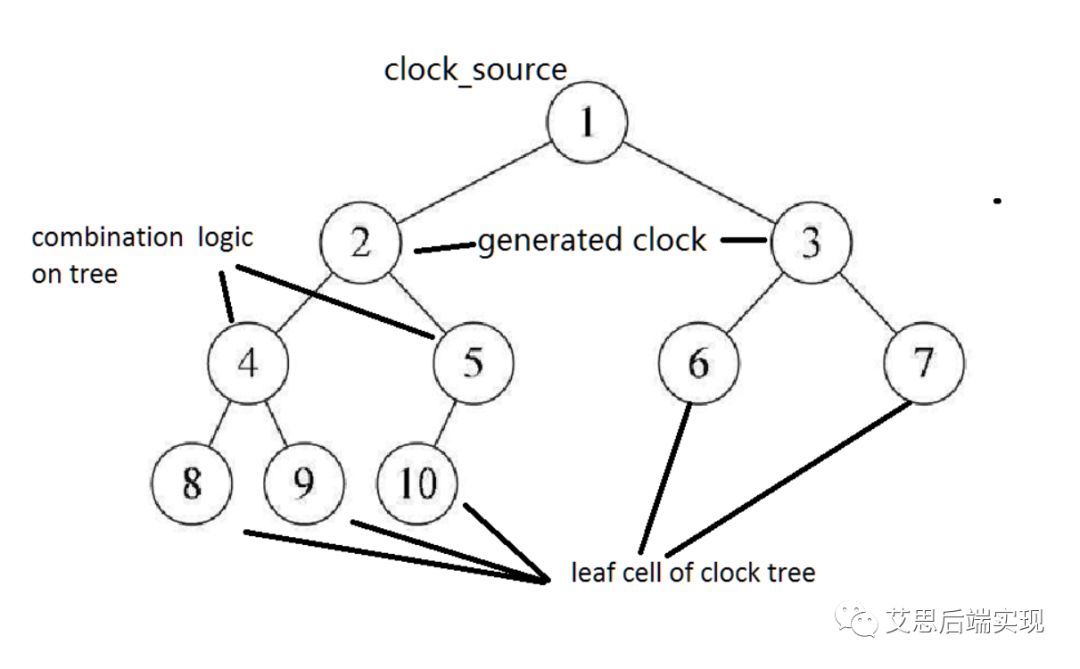 理論上講,所有隸屬于primary clock source (點位1)的leaf cell (點位6/7/8/9/10),它們之間都是可能有timing check的。從clock tree的角度而言,每一個leaf cell 的clock pin到clock source的delay都要盡可能的相似,這樣才會盡可能的接近place的時序結果(都為0,也是一種相似)。因為在place階段,我們假設所有的leaf FF到clock source 都是0 delay的(ideal_clock)。