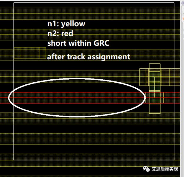 在這個有3個overflow的區(qū)域,這里有一個占用同一個track的兩個net shape,這就是典型的short的繞線。