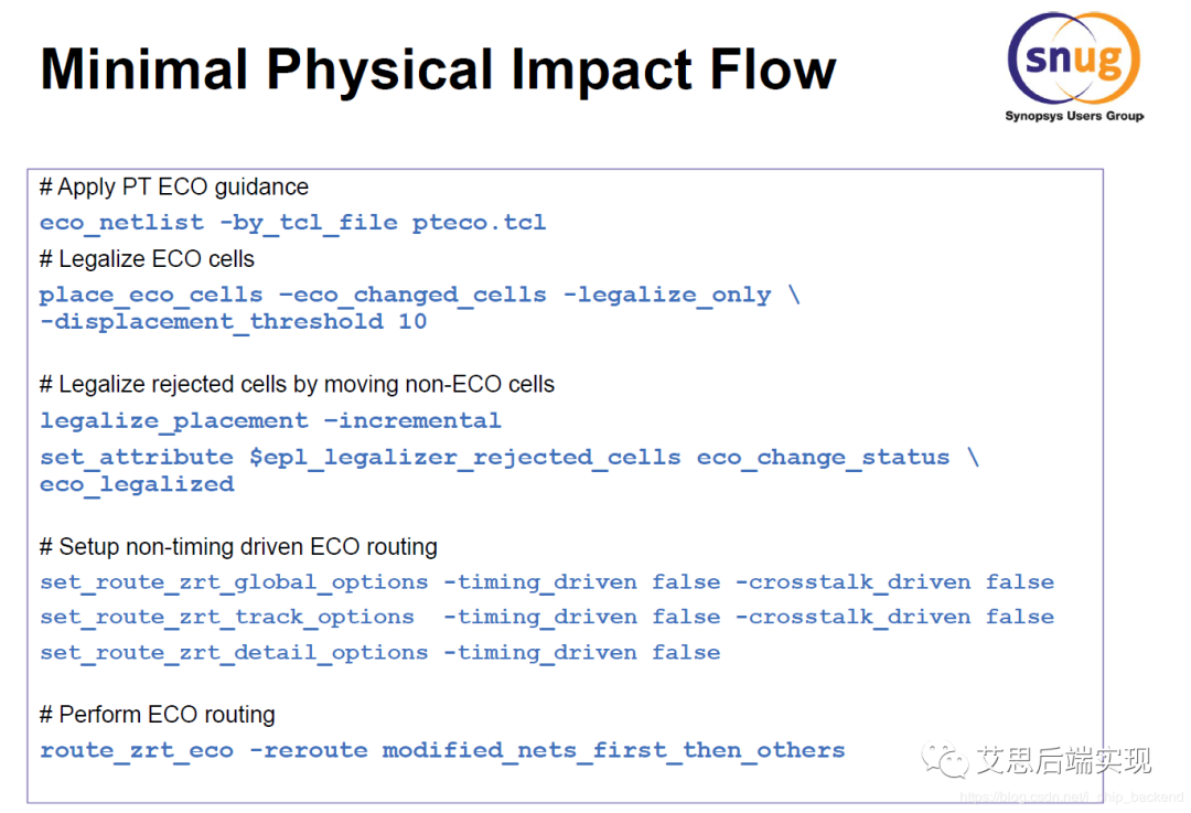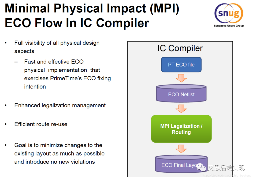 這里的關(guān)鍵節(jié)點(diǎn)是在,placement/legalization,任何器件的位置變動(dòng)帶來的意外的影響都有可能導(dǎo)致ECO無法按照期望方向進(jìn)行,這是因?yàn)?,原有?shù)據(jù)庫的cell的放置被調(diào)整,之前的繞線需要做相應(yīng)的調(diào)整,同時(shí)帶來更多的timing/驅(qū)動(dòng)能力的問題,這樣就會給數(shù)據(jù)庫帶來不期望的抖動(dòng)。為了盡可能保證原有數(shù)據(jù)庫的狀態(tài),這里需要引入一個(gè)新名詞:Minimal Physical Impact Flow(MPI):