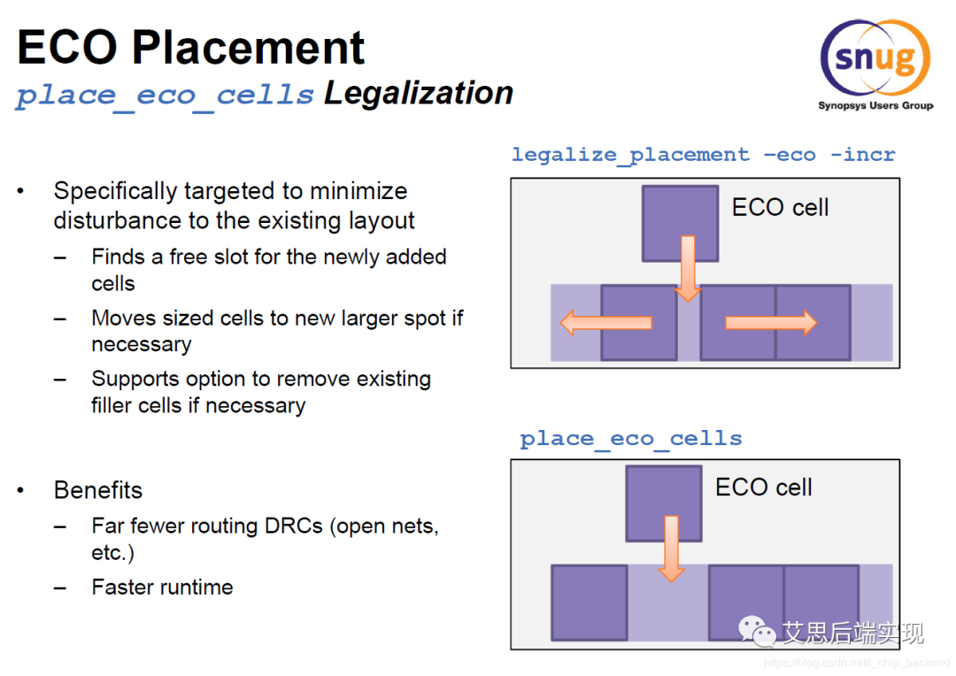 傳統(tǒng)的legalize命令在跑流程的時(shí)候,可以很好的進(jìn)行增量性的legalization,但是到了ECO這里,legalize的動(dòng)作相對于版圖的穩(wěn)定性而言,就是有點(diǎn)太大了,需要使用place_eco_cells來實(shí)現(xiàn)MPI: