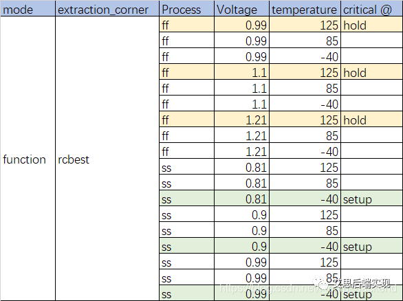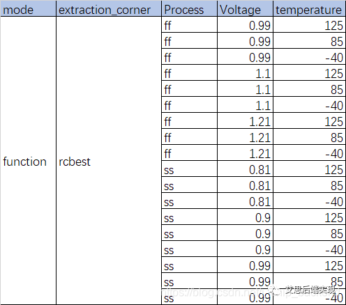 可以看到在一個(gè)模式和一個(gè)寄生參數(shù)抽取的前提下,有18個(gè)corner(支持DVFS的系統(tǒng))之多,如果考慮芯片模式和寄生參數(shù)的區(qū)別,會(huì)更為復(fù)雜,示例如下: