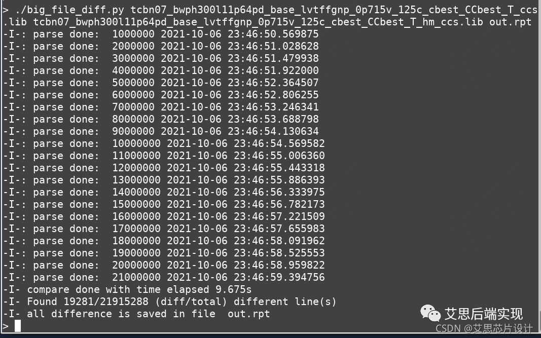 從以上截圖可以看到,使用python進行文件比對,基本在10秒內(nèi)可以完成兩個1.6G文件的比對,其中共找到了19K+的不同行,不同之處可以方便的導出到out.rpt里邊??匆幌抡w行數(shù):