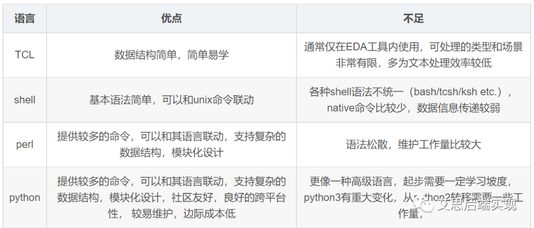 最開始工作的時候,主要的工作場景都是在EDA工具里邊。TCL確實好用,和工具的嵌套比較緊密,甚至可以調(diào)用shell或者perl腳本,基本可以在工具里邊完成大部分事情。一些短平快的腳本基本都用TCL開發(fā)。但是隨著腳本越來越多,那些隨意化的腳本非常的散亂,格式也不統(tǒng)一,由于是EDA based的,很多命令只能在特定的EDA工具里邊運行,交互起來缺乏便利性。