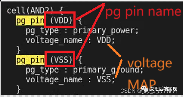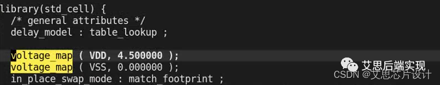 liberay scope 的PG 電壓定義:通常使用voltage_map 聲明,定義的電壓值,這里VDD和VSS可以看作會被后面引用的兩個變量名