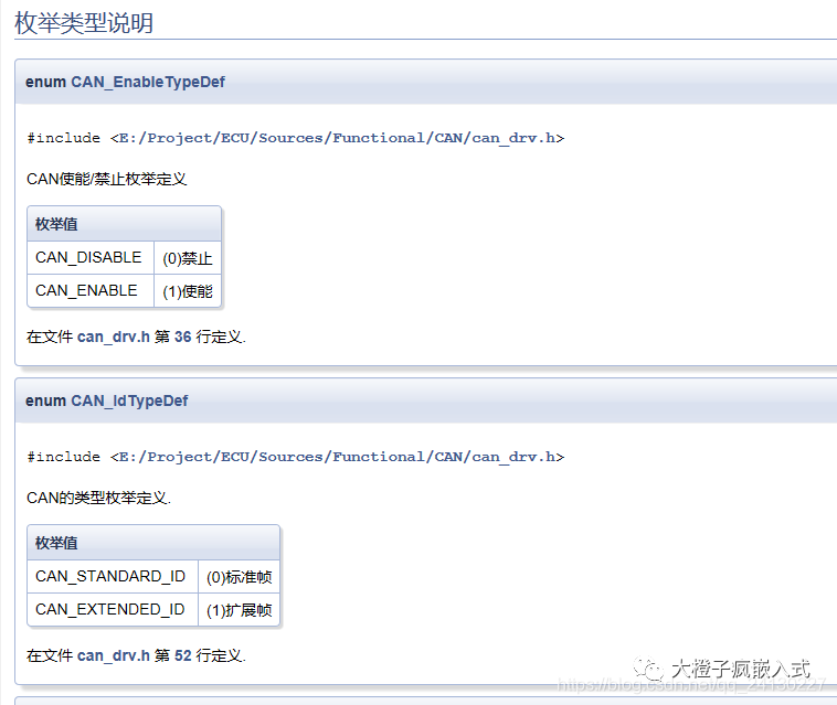 /** * @brief CAN使能/禁止枚舉定義 */typedef enum{ CAN_DISABLE = 0, /*!< (0)禁止 */ CAN_ENABLE = !CAN_DISABLE/*!< (1)使能 */}CAN_EnableTypeDef; /** * @brief CAN幀的格式枚舉定義. */typedef enum { CAN_DATA_FRAME = 0, /*!< (0)數(shù)據(jù)幀 */ CAN_REMOTE_FRAME /*!< (1)遠程幀 */} CAN_RtrTypeDef;