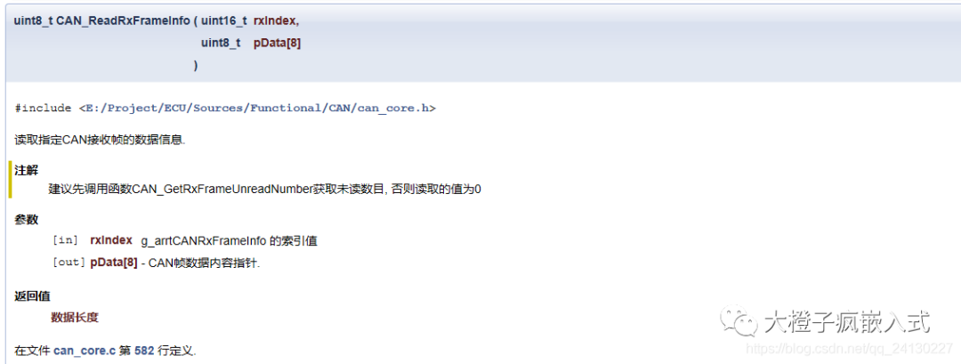 1/** 2 * @brief 讀取指定CAN接收幀的數(shù)據(jù)信息. 3 * 4 * @note 建議先調(diào)用函數(shù)... 5 * @param[in] rxIndex g_arrtCANRxFrameInfo 的索引值 6 * @param[in,out] pData - CAN幀數(shù)據(jù)內(nèi)容指針. 7 * @param[out] pLength - CAN幀數(shù)據(jù)長度. 8 * @retval 數(shù)據(jù)長度 9 */ 10int CAN_ReadRxFrameInfo(uint16_t rxIndex, uint8_t *pData, uint8_t *pLength) 11{ 12 ... 13}