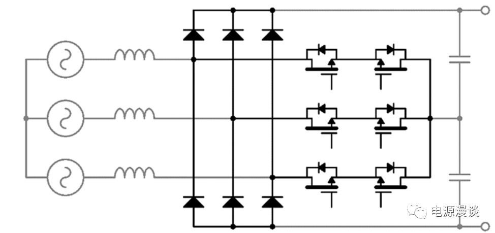 對(duì)于不需要反向工作的前級(jí)電路,可以采用維也納PFC架構(gòu),來(lái)得到800V的總線電壓,從中使用SiC mosfet也可以對(duì)導(dǎo)通損耗有很大幫助,如圖4所示。