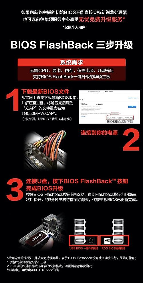 BIOS是主板上最基礎(chǔ)的固化程序,掌管硬件初始化、系統(tǒng)引導(dǎo)與底層設(shè)置。更新BIOS往往能帶來關(guān)鍵改進(jìn),比如修復(fù)硬件兼容性問題,修補(bǔ)安全漏洞,提升硬件穩(wěn)定性,甚至還能解鎖隱藏功能。為便于用戶升級(jí)BIOS,華碩主板支持BIOS FlashBack一鍵升級(jí)功能,無需CPU、內(nèi)存以及顯卡,僅需3步便可輕松完成升級(jí)。首先前往官網(wǎng),下載主板型號(hào)對(duì)應(yīng)的BIOS文件,解壓至U盤中并根據(jù)下載頁面說明重命名文件;其次連通主板電源,并將U盤插入主板后面板帶有【BIOS】標(biāo)識(shí)的USB接口;最后按住BIOS FlashBack按鈕3秒至指示燈閃爍3次后松開,約3分鐘后指示燈熄滅即完成升級(jí)。