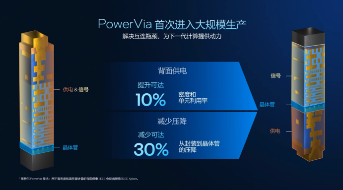 RibbonFET全環(huán)繞柵極晶體管采用了4條垂直堆疊的納米帶(Nano Ribbons)結(jié)構(gòu),讓柵極能夠從四面包電流通道完全環(huán)抱起來,不僅可以增強(qiáng)晶體管開關(guān)控制、響應(yīng)速度,抑制漏電,同時(shí)也具備更好地可擴(kuò)展性、設(shè)計(jì)靈活性,由此實(shí)現(xiàn)在同一個工藝平臺上圍繞高性能、低功耗等不同優(yōu)化方向設(shè)計(jì)多種晶體管規(guī)格。PowerVia背部供電將位于晶圓正面的供電電路轉(zhuǎn)移到了背面,將標(biāo)準(zhǔn)單元利用率和晶體管密度提升可達(dá)10%,將壓降(IR Drop)減少多達(dá)30%,將芯片運(yùn)行效率最高提升6%。