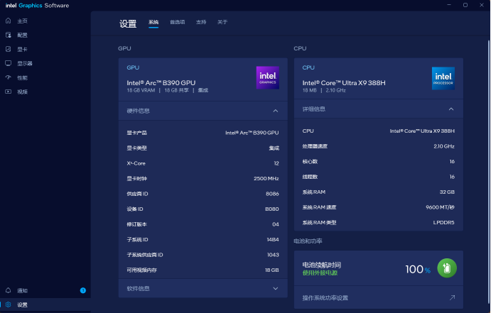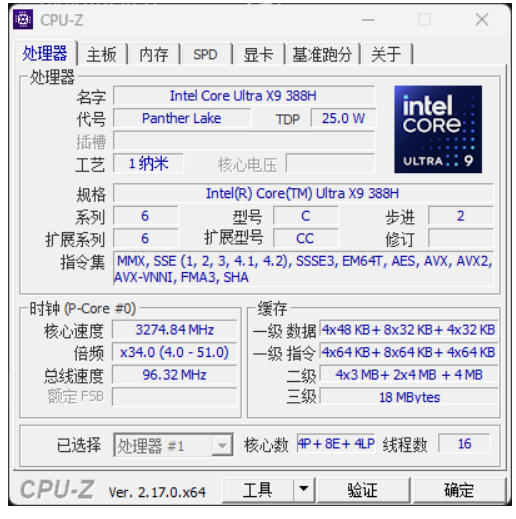 酷睿Ultra X9 388H處理器擁有16核心16線程,其中4個性能核架構(gòu)為Cougar Cove,最高睿頻頻率可達(dá)5.1GHz;8個能效核以及4個低功耗能效核架構(gòu)均為Darkmont,睿頻頻率分別可達(dá)到3.8GHz、3.7GHz。處理器擁有18MB緩存,最高支持96GB的LPDDR5x 9600MT/s內(nèi)存;集成的英特爾銳炫B390擁有12個Xe核心;全新NPU 5算力50TOPS;基礎(chǔ)TDP 25W。