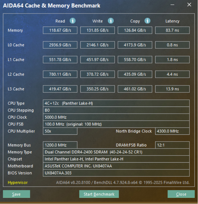 評測機(jī)搭載了32GB的LPDDR5x-9600MT/s內(nèi)存,性能確實(shí)強(qiáng)大。通過測試,讀取速度達(dá)到了118.67GB/s,寫入速度達(dá)到131.85 GB/s,拷貝速度為126.84GB/s,延遲僅為83.7ns。出色的內(nèi)存對于內(nèi)容創(chuàng)作者、游戲玩家或者有AI體驗(yàn)需求的用戶而言,帶來的提升就不用多說了。