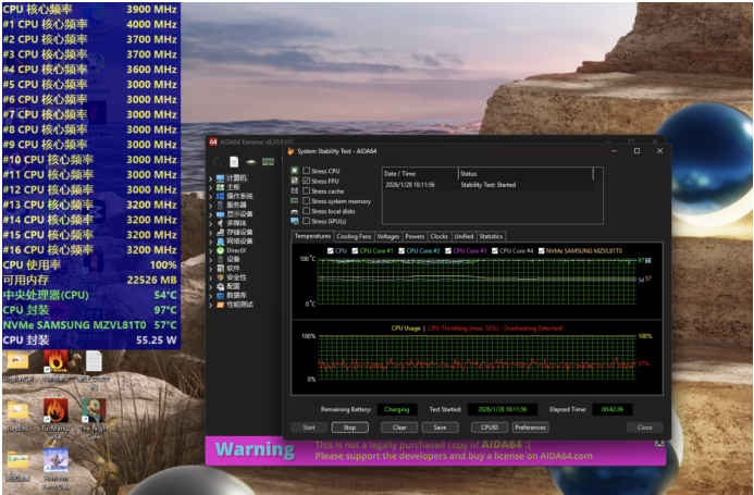 現(xiàn)在就開始揭曉酷睿Ultra X9 388H的CPU測試成績。需要指出的是,本次評測的華碩靈耀14雙屏2026在性能模式下烤機(jī)功耗穩(wěn)定在55W左右,CPU封裝溫度97℃。除續(xù)航相關(guān)測試外,系統(tǒng)均設(shè)定為性能模式。