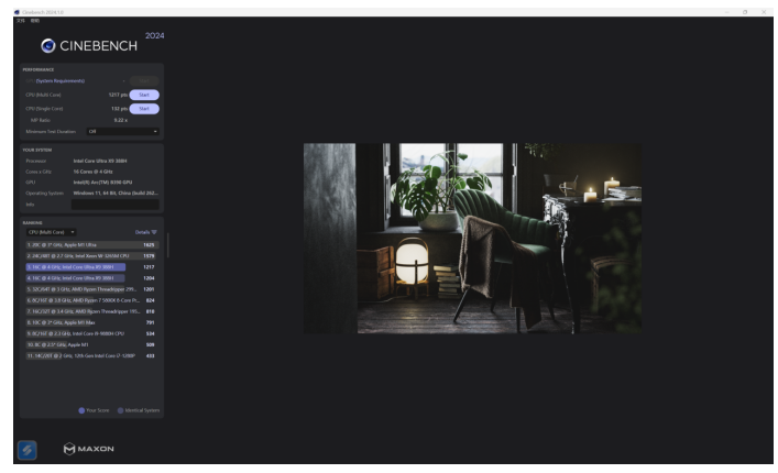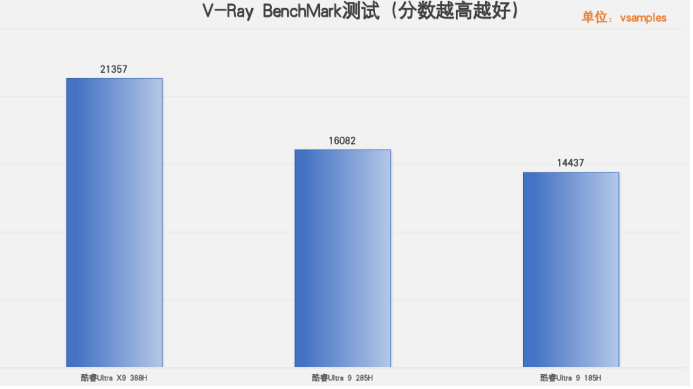 渲染性能方面,通過V-Ray Benchmark進(jìn)行測試,酷睿Ultra X9 388H的成績?yōu)?1357,相比酷睿Ultra 9 285H提升了約33%;相比酷睿Ultra 9 185H提升了約48%。