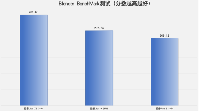 在Blender Benchmark測試中,酷睿Ultra X9 388H的monster成績?yōu)?30.23;junkshop成績?yōu)?9.02;classroom成績?yōu)?2.43。綜合成績,領(lǐng)先酷睿Ultra 9 285H約21%;領(lǐng)先酷睿Ultra 9 185H約35%。