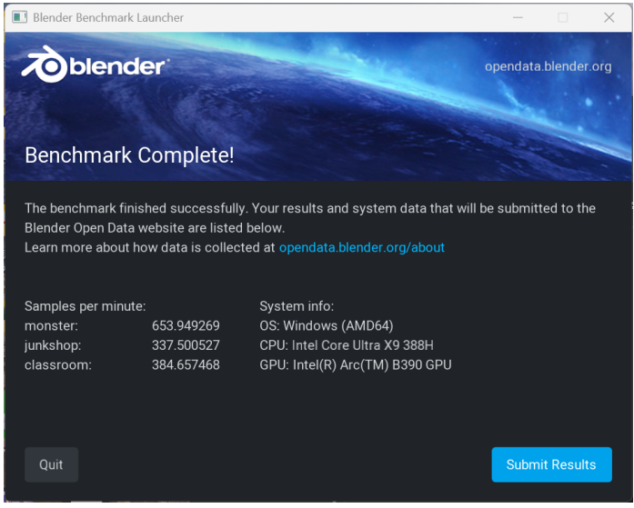 在Blender Benchmark的GPU測試中,銳炫B390得分如下,綜合成績領(lǐng)先銳炫140T約73%。