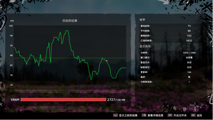 《孤島驚魂:新曙光》在1080P分辨率、低畫質(zhì)設(shè)定下,平均幀數(shù)達(dá)到了103,調(diào)整至高畫質(zhì)平均幀數(shù)為86。
