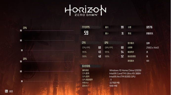 《地平線:零之曙光》在1080P分辨率、低畫質(zhì)設(shè)定下,平均幀數(shù)達(dá)到了91,提升至高畫質(zhì)平均幀數(shù)為82。在2K分辨率下與高畫質(zhì)設(shè)定下幀數(shù)為59,若是低畫質(zhì)則幀數(shù)能達(dá)到78。