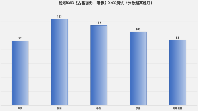 對銳炫B390的XeSS進(jìn)行了測試,在《古墓麗影:暗影》1080P分辨率、高畫質(zhì)設(shè)定下,開啟XeSS的性能模式能夠帶來約34%的幀數(shù)提升。