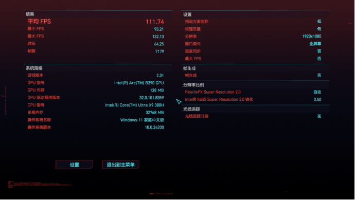 《賽博朋克2077》1080P分辨率、低畫質(zhì)設(shè)定下,關(guān)閉超采樣和幀生成,平均幀數(shù)為84;開啟超采樣、關(guān)閉幀生成,平均幀數(shù)為112;開啟超采樣、開啟幀生成,則平均幀數(shù)264(最高幀數(shù)甚至可以達(dá)到373)。