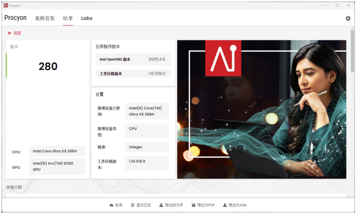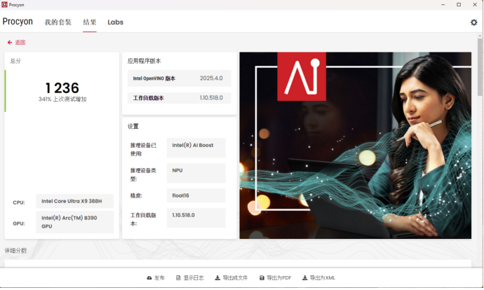 關(guān)于酷睿Ultra X9 388H每個計(jì)算單元的提升就不再贅述了,直接通過UL Procyon來檢測一下其AI性能。在CPU Integer測試中,得分為280;GPU Float16測試成績達(dá)到了1518,相較于上代成績幾乎翻倍;NPU方面盡管總體算力沒有明顯增加,但英特爾通過架構(gòu)優(yōu)化仍舊讓NPU的性能進(jìn)一步提升,在Float16測試中成績達(dá)到了1236。