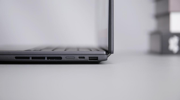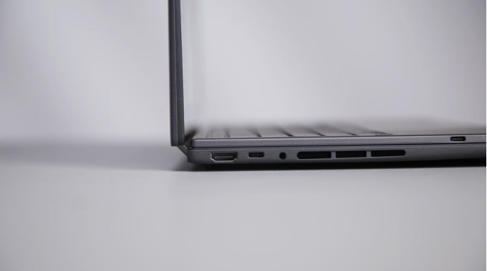 接口方面,在機(jī)身左側(cè)提供了HDMI 2.1、雷電4(40Gbps)、3.5mm音頻接口。機(jī)身右側(cè)為電源鍵、雷電4(40Gbps)、USB A(10Gbps)。