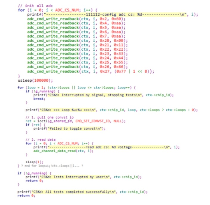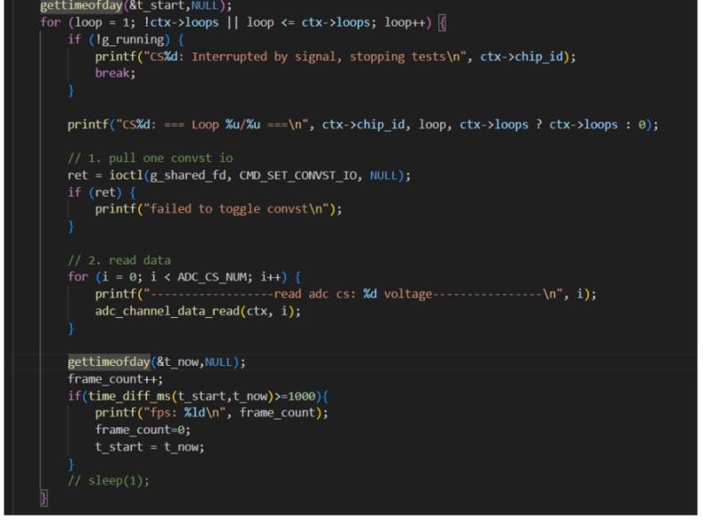 好了,接著看測試邏輯 發(fā)送一次 CMD_SET_CONVST_IO 后,開始讀取每個通道的值