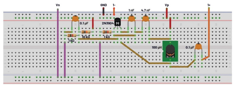 使用無焊試驗板構(gòu)建圖2所示的Colpitts振蕩器。從器件套件中選擇偏置電阻R1和R2的標(biāo)準(zhǔn)值,使得發(fā)射極電阻R3設(shè)置為1 kΩ時,NPN晶體管Q1中的集電極電流約為1 mA。根據(jù)所選擇的C1、C2和L1值,振蕩器的頻率可以在大約500 kHz到2 MHz的范圍內(nèi)變化。首先設(shè)置L1 = 100 μH、C1 = 4.7 nF且C2 = 1 nF。此振蕩器電路可產(chǎn)生超過10 V p-p的正弦波輸出,其頻率近似于由所選L1值設(shè)定的頻率。