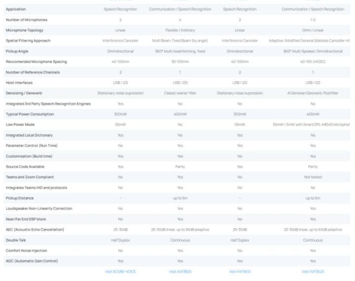 該語(yǔ)音方案選型指南涵蓋了XMOS全系列語(yǔ)音產(chǎn)品組合,設(shè)計(jì)旨在幫你更快速高效地做出科學(xué)選型決策。只需回答幾個(gè)簡(jiǎn)短問題,如計(jì)劃使用的麥克風(fēng)數(shù)量、是否需要遠(yuǎn)場(chǎng)工作模式、所需的板載處理能力等,就能獲得量身定制的XMOS最優(yōu)語(yǔ)音方案推薦。同時(shí),XMOS還提供詳盡的對(duì)比表格,清晰呈現(xiàn)各方案的核心差異,讓你在進(jìn)行對(duì)比后安心地做出抉擇。
