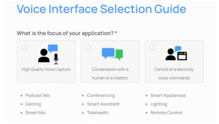 為此,XMOS打造了語(yǔ)音方案選型指南——這款交互式工具可通過幾個(gè)簡(jiǎn)單問題,助你快速為應(yīng)用場(chǎng)景匹配理想的XMOS語(yǔ)音方案。無論你的項(xiàng)目需要通信功能、遠(yuǎn)場(chǎng)拾音、抗噪能力,還是需要超高能效的嵌入式語(yǔ)音處理能力,該網(wǎng)上支持平臺(tái)都能提供可進(jìn)入實(shí)際應(yīng)用的推薦方案。
