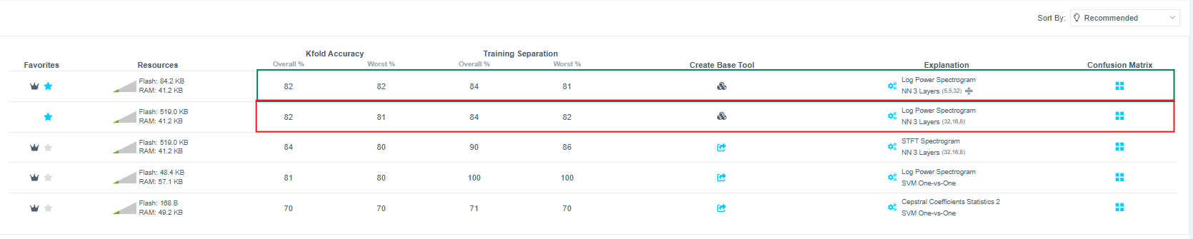 圖1–5展示了該對(duì)比的詳細(xì)信息。圖1顯示AI Explore?的對(duì)比結(jié)果;圖2和圖3的混淆矩陣確認(rèn)精度保持一致;圖4和圖5的紅框部分(Flash Parameters)展示了模型大小和復(fù)雜度的核心差異,該數(shù)值反映了實(shí)際編譯后部署的模型,比Explore頁(yè)面上的估算更準(zhǔn)確。