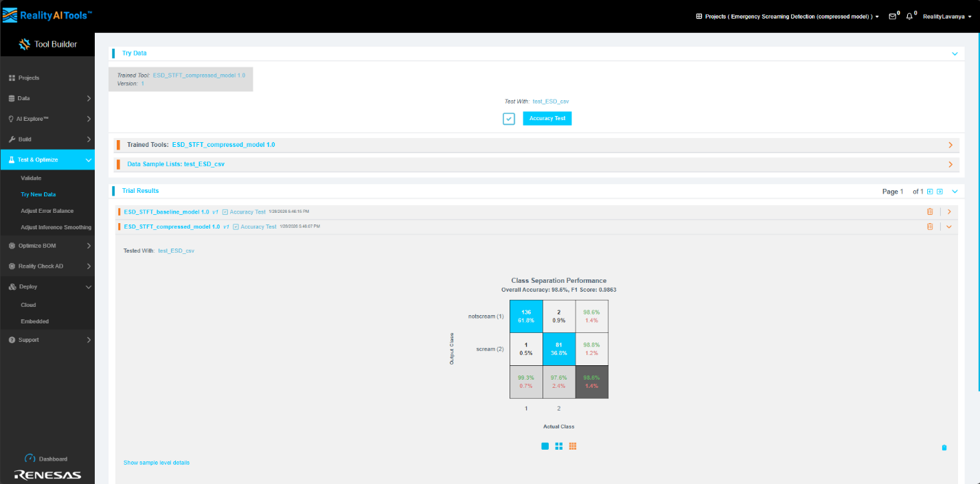 你可以在Test & Optimize→Try New Data區(qū)域測(cè)試壓縮后的模型。選擇壓縮版本的Trained Tool模型以及所需的測(cè)試數(shù)據(jù)集,然后運(yùn)行AccuracyTest(準(zhǔn)確率測(cè)試),即可評(píng)估該模型在未見過(guò)的數(shù)據(jù)上的表現(xiàn)。