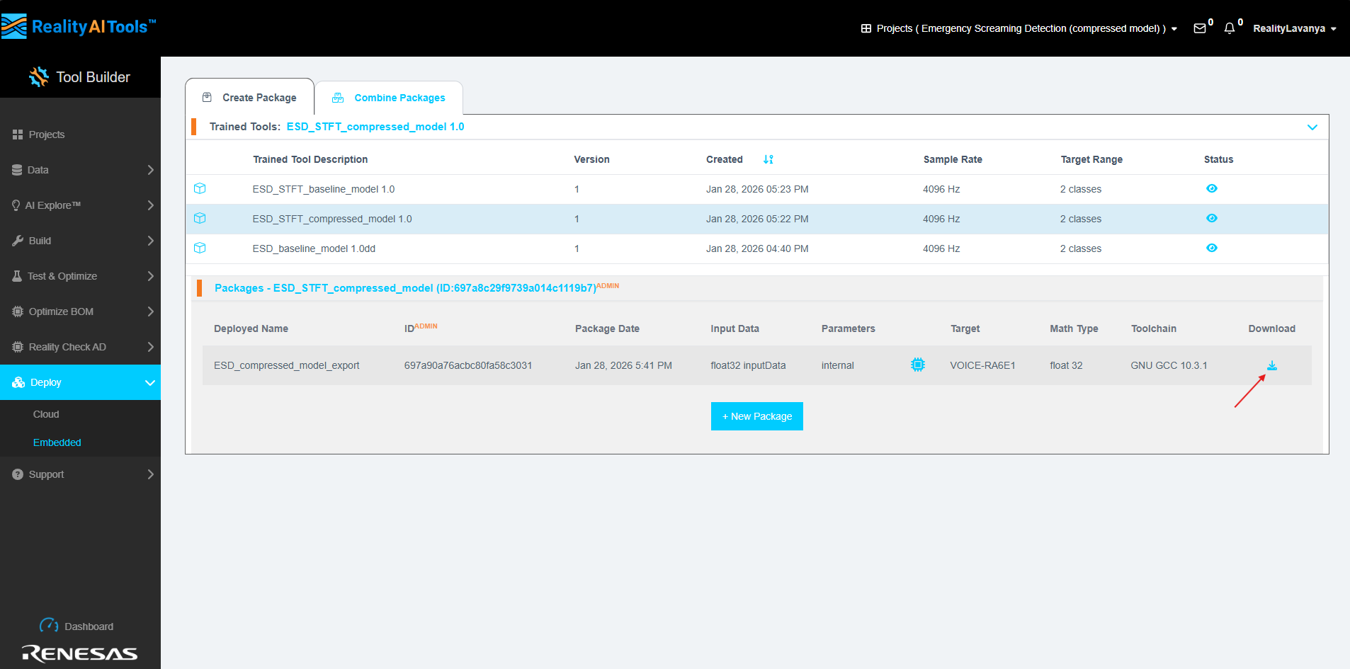 部署同樣非常簡(jiǎn)單。在驗(yàn)證壓縮模型并確認(rèn)其性能符合預(yù)期后,你可以進(jìn)入Deploy→Embedded完成部署流程。選擇已經(jīng)訓(xùn)練好的壓縮模型,并根據(jù)目標(biāo)嵌入式系統(tǒng)的約束條件創(chuàng)建新的部署包。隨后,下載生成的可導(dǎo)出模型包,并將其部署到目標(biāo)硬件板上。與Reality AI Tools®中其他模型的部署方式完全一致,使用壓縮模型無(wú)需任何額外步驟或特殊處理。