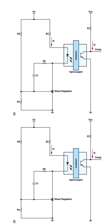 工作電流低于此范圍會導(dǎo)致光功率不足,進而造成光電晶體管激活不充分,反饋調(diào)節(jié)不佳。另一方面,工作電流超過上限會產(chǎn)生熱應(yīng)力,縮短LED壽命,并因老化加速和結(jié)發(fā)熱效應(yīng)而降低光學(xué)效率。在實際設(shè)計中,LED電流由光耦合器LED陽極處的電阻(R2)設(shè)定;當(dāng)分流調(diào)節(jié)器響應(yīng)輸出電壓的變化而調(diào)整其陰極電流時,LED電流會動態(tài)調(diào)整。