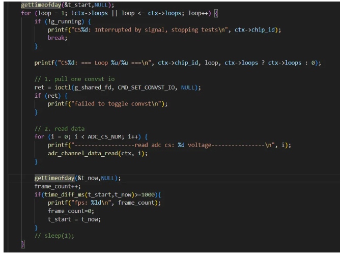 好了,接著看測(cè)試邏輯發(fā)送一次CMD_SET_CONVST_IO 后,開(kāi)始讀取每個(gè)通道的值: