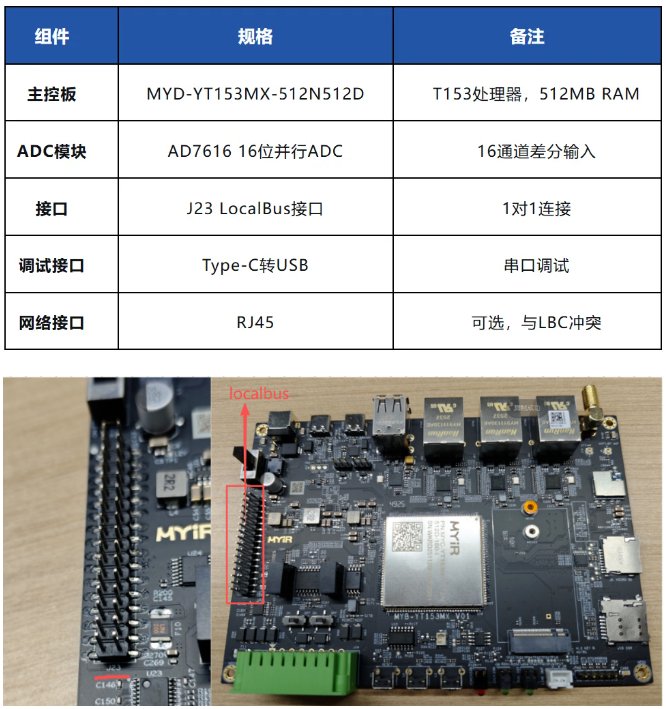 米爾MYD-YT153開(kāi)發(fā)板搭載全志T153處理器,提供LocalBus(LBC)并行總線接口,適合連接高速外設(shè)。AD7616是ADI公司推出的16位高精度并行ADC,具有16通道差分輸入,廣泛應(yīng)用于工業(yè)數(shù)據(jù)采集、儀器儀表等領(lǐng)域。
