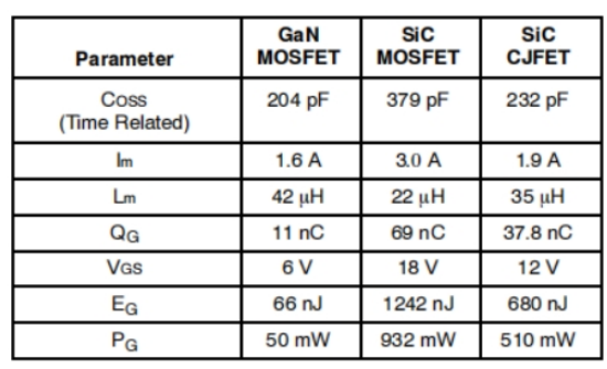 影響開關(guān)特性的主要差異源于器件的輸出電容(COSS)。通常,SiC MOSFET具有較大的COSS,這是由于其需要更大的裸芯尺寸才能實(shí)現(xiàn)與GaN HEMT或SiC CJFET相當(dāng)?shù)膶?dǎo)通電阻(Rds,on),如表2所示。該電容與勵(lì)磁電流共同決定了半導(dǎo)體器件的開關(guān)轉(zhuǎn)換速度。