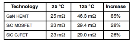 Rds,on會(huì)隨溫度升高而增加,其標(biāo)稱值僅適用于25℃的結(jié)溫。下表對(duì)比了典型GaN器件、安森美(onsemi)M3S 650 V器件以及安森美第四代CJFET 750 V器件的導(dǎo)通電阻隨溫度上升的情況。