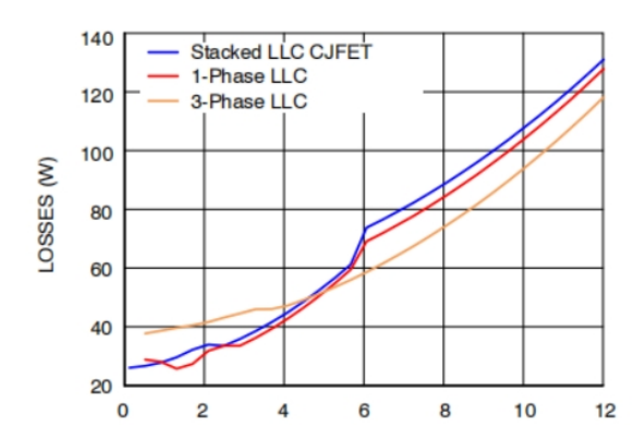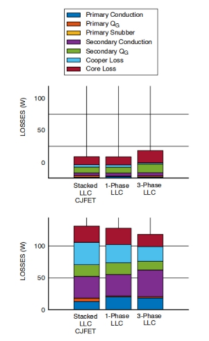 圖2. 采用不同原邊開關(guān)器件的堆疊式LLC轉(zhuǎn)換器系統(tǒng)損耗