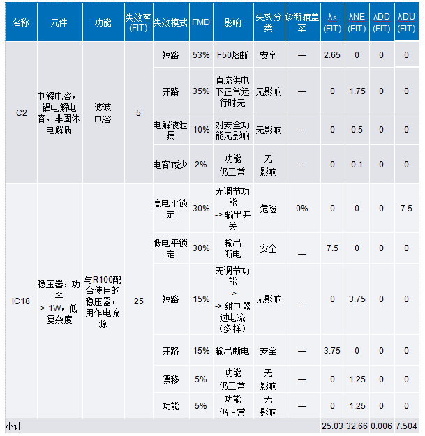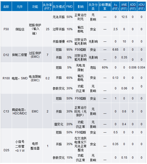 表1.電源電路的FMEDA分析(基于IEC 60812:2018 標準表F.12)
