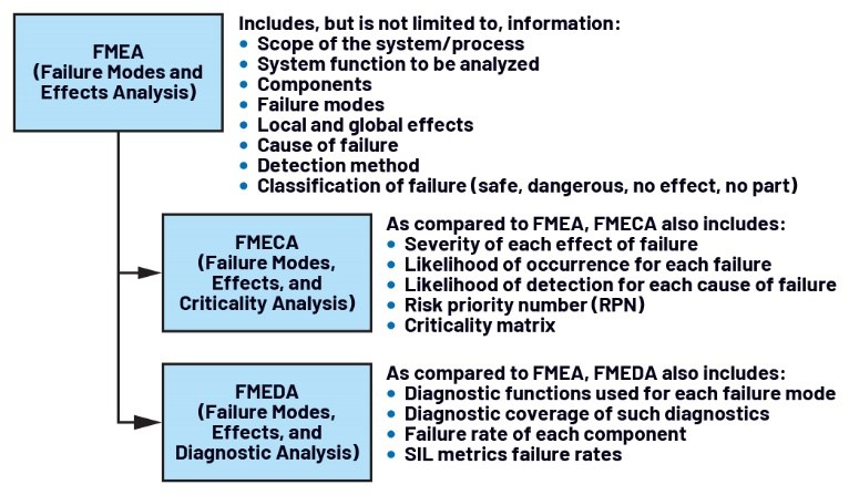 圖1展示了典型FMEA的構(gòu)成要素及其一些廣為人知的變體:FMECA和FMEDA。FMEA通?;谝韵滦畔ⅲ合到y(tǒng)或流程的相關信息、待分析的功能、組成系統(tǒng)的組件、每個組件的失效模式、局部及全局影響等。當FMEA根據(jù)失效模式的重要性對其進行優(yōu)先級排序時,稱為失效模式、影響及危害性分析(FMECA)。當FMEA采用某種度量方式來體現(xiàn)診斷功能的有效性時,則稱為失效模式、影響及診斷分析(FMEDA)。1,2