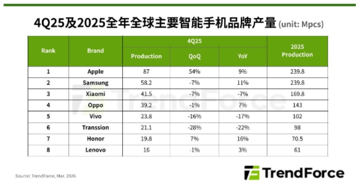 分析主要品牌2025年生產(chǎn)表現(xiàn),Apple因iPhone 17系列受惠終端定價得宜,銷售告捷,第四季手機產(chǎn)量季增50%以上,達到8,700萬支左右,創(chuàng)單季新高。若其2026年能在終端定價顯著讓利,則有助維系生產(chǎn)與銷售表現(xiàn)。