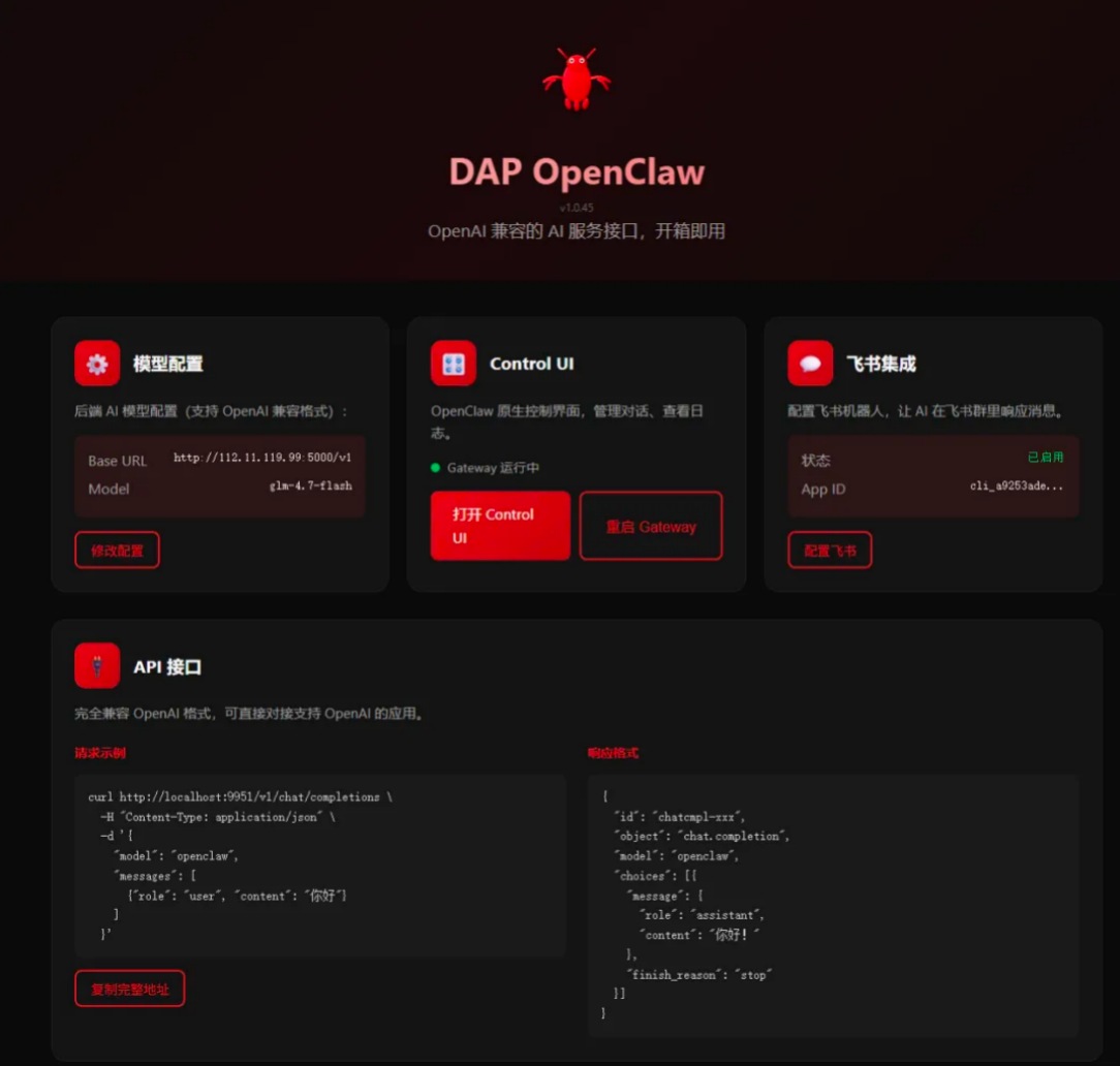 當前DAP OpenClaw穩(wěn)定版本為v1.0.45,完美適配標準Docker環(huán)境,部署流程高效簡潔,同時支持數(shù)據(jù)加密存儲、端口自定義、認證Token配置等安全與個性化能力,可廣泛滿足團隊內(nèi)部AI助手搭建、自有產(chǎn)品AI能力賦能、私有化大模型體驗、智能辦公協(xié)同等多種場景需求,以安全、高效、便捷的特性,助力各類用戶零門檻、低成本落地私有AI服務(wù)。